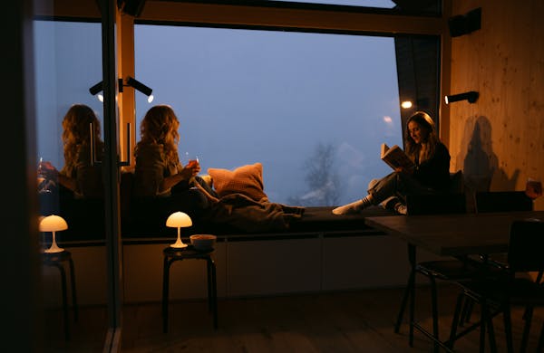 Das Schönste an den Abenden in der Hütte waren die ruhigen Momente - mit einem Buch auf der gemütlichen Bank im Fenster, umgeben von vielen Kissen und einer riesigen Decke, einem leckeren Getränk auf dem kleinen Hocker neben der Bank und dem Blick auf die vom Mond erleuchteten Berge.