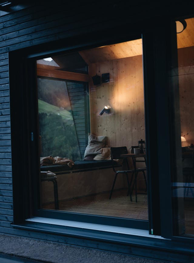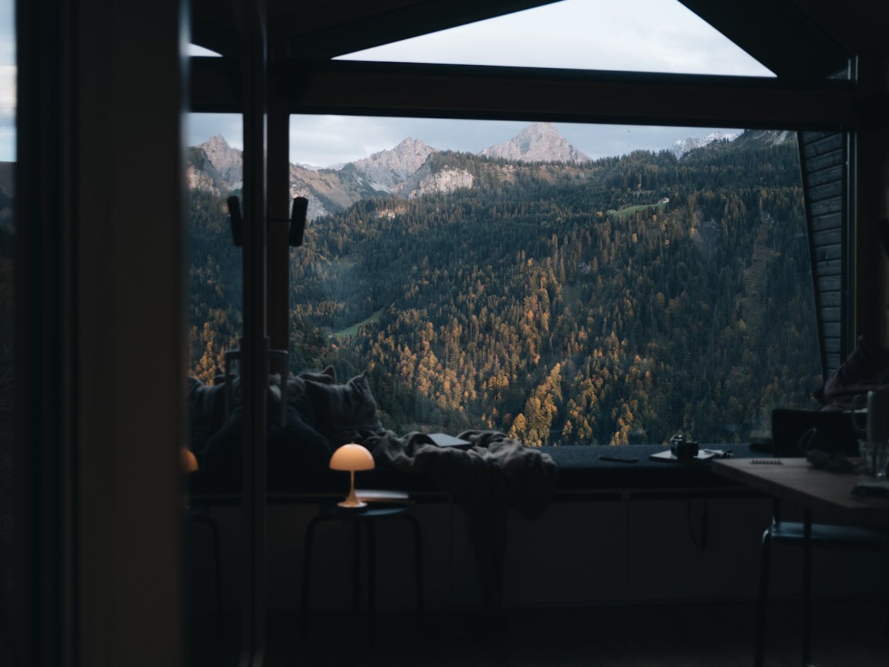Die Cabins lagen deutlich höher, als Lili und ich erwartet hatten. Als wir unsere Cabin aufgeschlossen haben, sind wir im Flur stehen geblieben, haben angefangen zu lachen und haben uns ernsthaft gefragt, ob wir in einer Videosimulation gelandet sind. Ich hab noch nie einen Ausblick gesehen, der mir die Illusion gegeben hat, in einen überdimensionalen Bildschirm hinein zu fallen. Draußen lag die schönste Bergkulisse, die ich je gesehen habe - Bäume in allen Farben und selbst durch die Scheibe kristallklar. Durch das große Panoramafenster haben wir nicht mal die Wiese vor der Cabin gesehen und haben uns gefühlt, als würde die gegenüberliegende Bergseite immer näher kommen und die Cabin schwerelos in der Bergwand stehen.