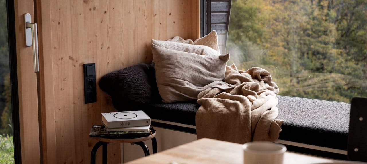 Lili und ich arbeiten seit Jahren zusammen und sind eigentlich Team absolute Effizienz. Unter normalen Umständen hätten wir sofort das Auto ausgepackt und den Kühlschrank gefüllt. Hier nicht. Wir sind auf die riesige Fensterbank vor dem Panoramafenster gefallen und lagen dort erstmal eine ganze Weile - ab jetzt waren Zeit und Raum egal. Als es irgendwann dunkel wurde, haben wir die Sauna angemacht, uns die Cabin genauer angesehen, sind barfuß durchs taunasse Gras um die Cabin getappt und haben das Nötigste in den Schränken verstaut. Endlich Zeit zum Kochen. Es hat sich angefühlt, als hätten wir einen Schalter auf Langsamkeit umgelegt. Ich glaube, an dem Abend hat keine von uns auch nur einen Blick auf die Uhr geworfen und nach zwei ausgiebigen Sauna-Runden sind wir unfassbar tief eingeschlafen.