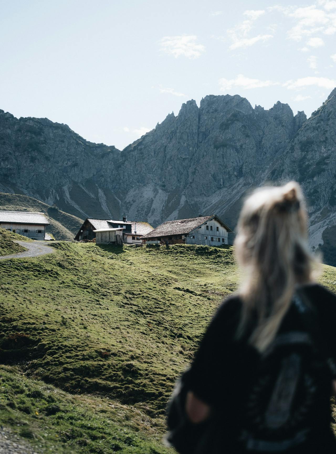 Nach zwei Tagen haben Lili und ich festgestellt, dass die Bergluft irgendwas mit uns gemacht hat. Oder die Ruhe? Der neue Rhythmus? Die Langsamkeit? Nichts schien uns aus der Ruhe zu bringen. Angefixt von unserer ersten Mini-Wanderung wollten wir diesmal den Stafelalpsee finden und testen, ob uns Germknödel und Almdudler noch genauso gut schmecken, wie als Kind. Nach einer kurzen Recherche der Umgebung sind wir mit dem Auto in Richtung Damüls gefahren, haben das Auto in Fontanella abgestellt und sind von dort dem Wanderweg Richtung Stafelalpsee und Franz-Josef-Hütte gefolgt. Der Weg war deutlich steiler als zur Breithornhütte am Tag zuvor, der Wind fegte über die Gipfel und hat es uns schier unmöglich gemacht, sich zu Beginn des Weges irgendwie zu unterhalten. Auch wenn wir es von unserer Arbeit im Sommer an der französischen Atlantikküste üblicherweise gewohnt sind, Wind und Wetter ausgesetzt zu sein, war die Höhe ein Faktor, den wir davor nicht einkalkuliert hatten und während der ersten stürmischen halben Stunde mit Wind in den Ohren haben wir uns mehrfach gefragt, ob man auf einem befestigten Weg allein durch die Aussicht auf eine Bergkette Höhenangst entwickeln kann.