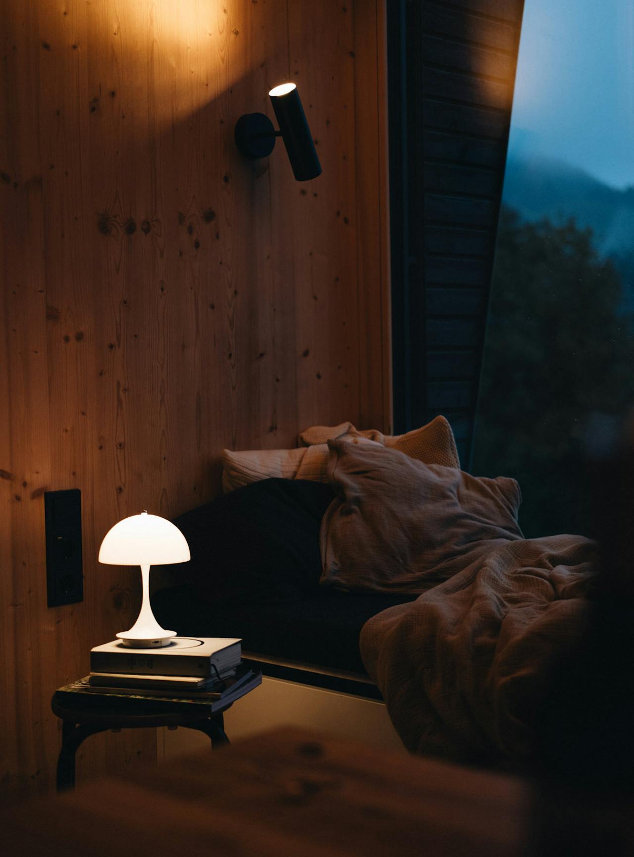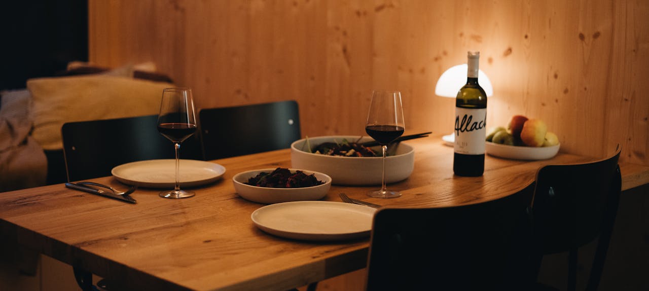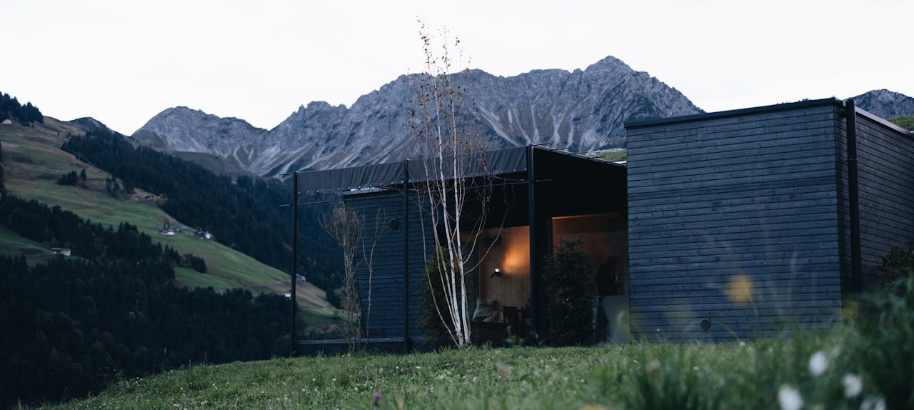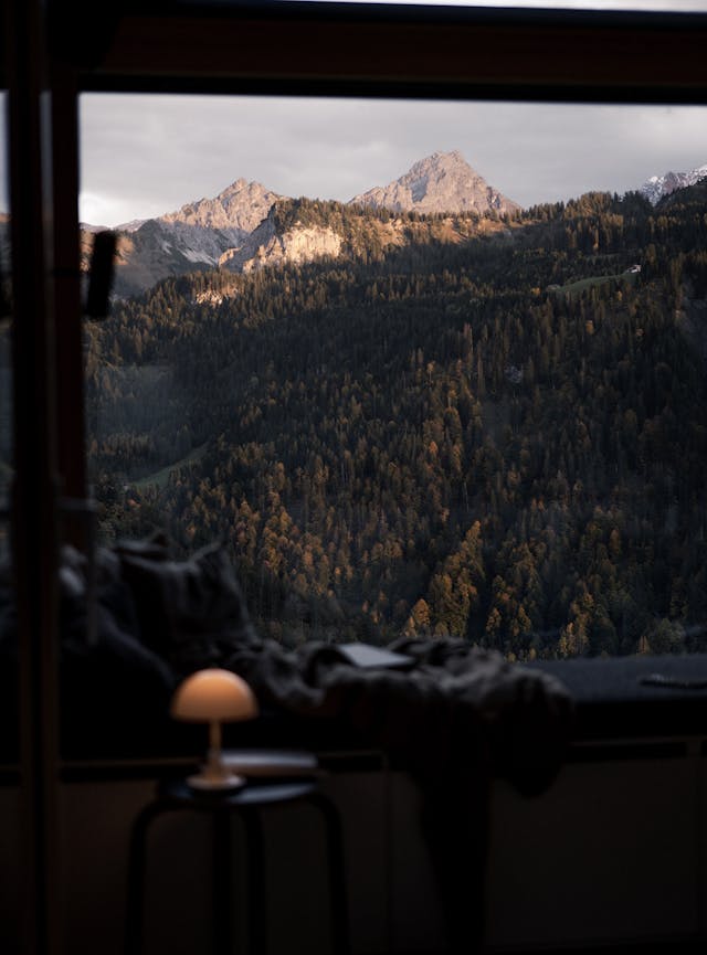 Bei unserem letzten Abendessen hat die Dämmerung die Bergwand gegenüber in leuchtend rotes Licht getaucht und die Cabin hat jeden letzten Lichtstrahl aufgefangen. Hier sind es all die kleinen Details, die zusammenkommen und uns vergessen lassen, was außerhalb vom Walsertal passiert. Lili und ich sind beide sehr sensibel, was Farben und Muster angeht und in einen Raum zu kommen, in dem alles aufeinander abgestimmt und nichts zu viel ist, ist genauso erfrischend und beruhigend für den Geist wie die Umgebung, die die Cabin widerspiegelt. Der sanfte Sound durch die Speaker an der Wand, der holzige Geruch der Sauna, warme Lichtquellen - all das hat unser Nervensystem absolut heruntergefahren. Wir haben gelernt, dass ab und zu Zeit keine Rolle spielen muss, dass die Welt nicht untergeht, wenn wir ein paar Stunden nicht auf einen Bildschirm schauen und dass es sich immer, immer lohnt, sich eine Auszeit zu nehmen.
