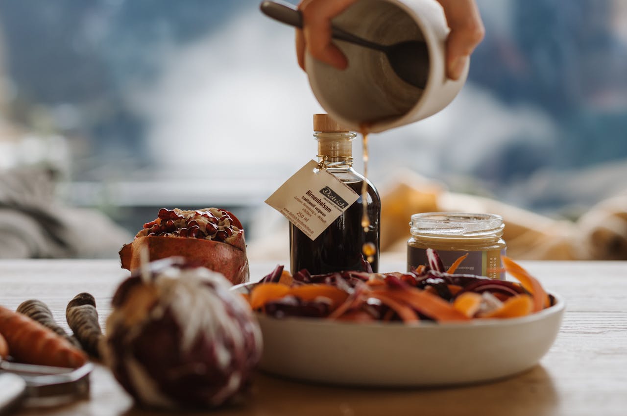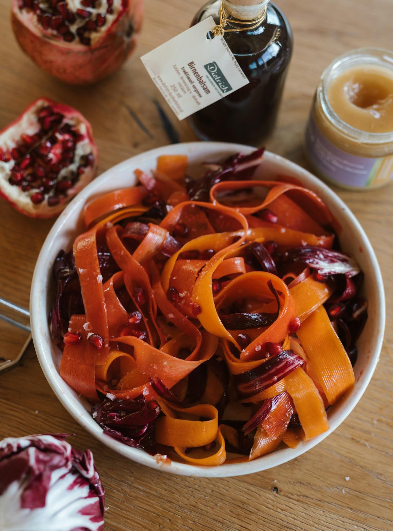 Dieser leichte, frische Salat passt einfach immer – ob als Vorspeise, Beilage oder schnelle Zwischenmahlzeit. Die rohen Karotten bringen wertvolle Ballaststoffe mit, die den Darm wohltuend unterstützen. Granatapfelkerne sorgen für Frische und wertvolle Antioxidantien, während der Birnenessig aus dem Litzi Hofladen dem Ganzen eine feine, aromatische Note verleiht.