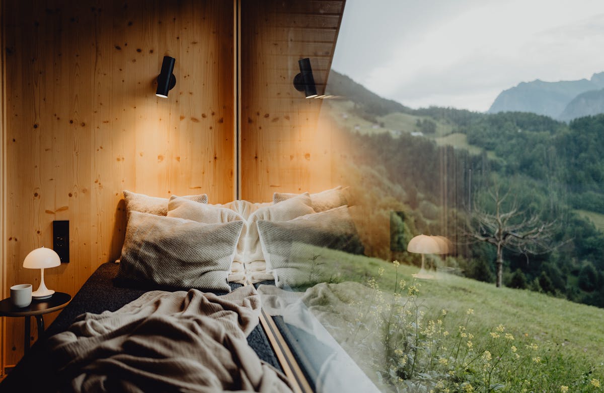 Und doch ist und bleibt das Schönste nach einem Ausflug in die Natur und den unzähligen Angeboten im Großen Walsertal, die Rückkehr in die Cabin: Die Sauna schnell angestellt, sodass sie nach knapp drei Stunden für den abendlichen Saunagang aufgeheizt ist, den frischen Holzduft der Cabins eingesogen, die grandiose Aussicht aus dem Fenster und die minimalistische wie hochwertige Einrichtung genießend finde ich persönlich an diesem ganz besonderen Ort Ruhe, Inspiration und Klarheit. Nichts, was einen ablenkt – nur die Natur um einen herum und Zeit zu Sein.