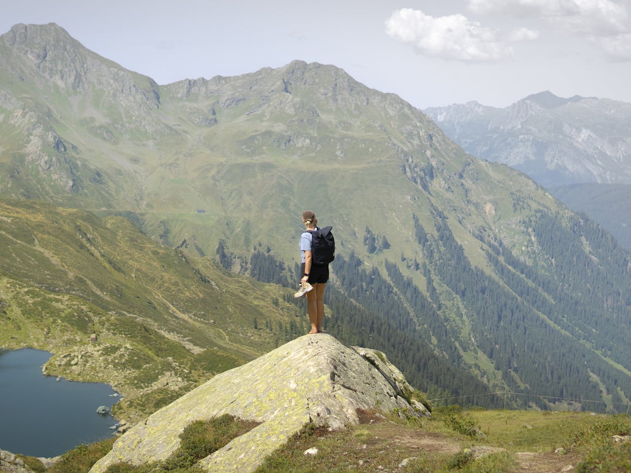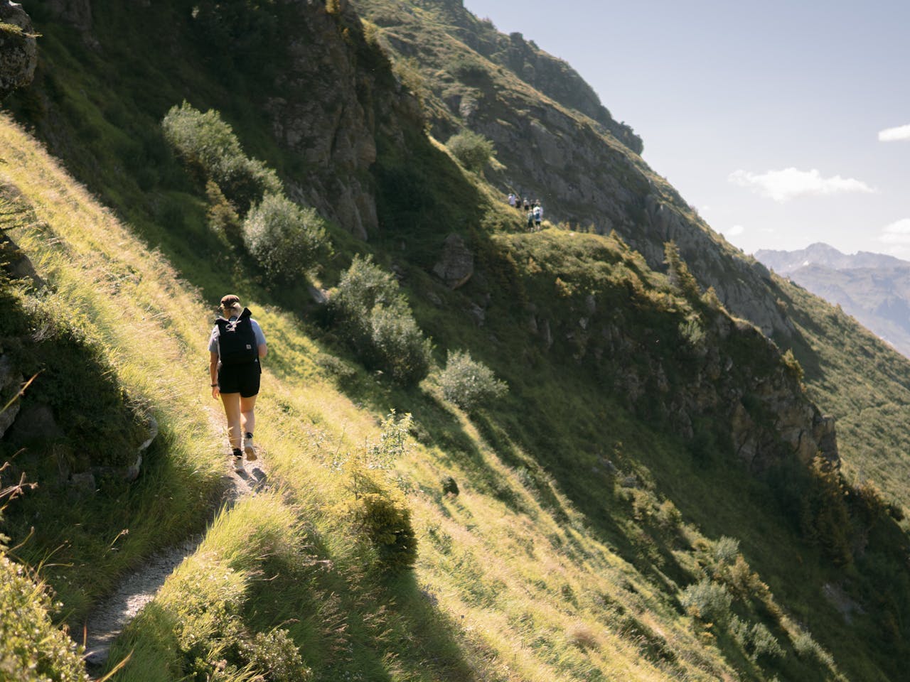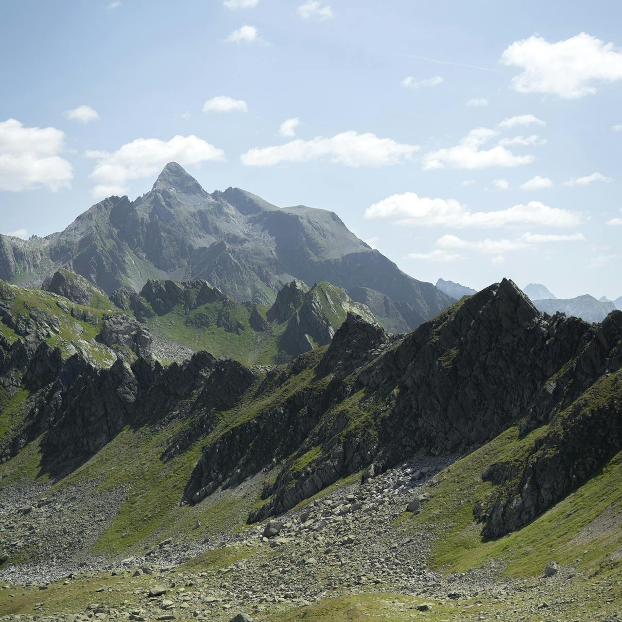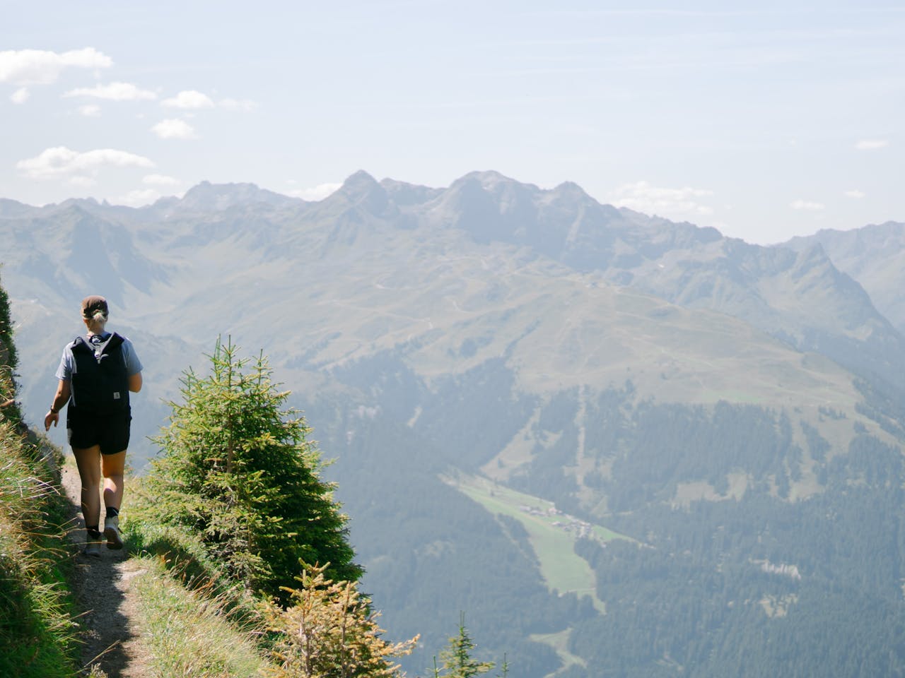 Los geht's mit der Grasjochbahn hoch zur Grasjoch-Hütte. Dort wurden wir durch Pferde und Glockengeläute empfangen und unsere Wanderung wurde im wahrsten Sinne „eingeläutet“. Nach einigen hundert Metern wurde der Wanderweg schon recht schmal und führte an tiefen Abgründen entlang. Ab hier wussten wir, was mit „trittfest“, „festes Schuhwerk“ und „schwindelfrei“ gemeint war! Zum Teil war der Wanderweg so schmal und steinig, dass wir uns mit unseren Händen festhalten und abstützen mussten. Nichtsdestotrotz hat der Ausblick über St. Gallenkirch und die Region sehr viel entschädigt! Es war wirklich atemberaubend schön über die Täler, auf saftig grüne Wiesen und verschneite Bergspitzen zu schauen. An den Wegrändern gab es Heidelbeeren zu pflücken, Wildbienen und Schmetterlinge schwirrten um uns herum. Vogelgezwitscher begleitete uns auf dem Wormser Höhenweg bis zum Roßbergjoch, dem höchsten Punkt der Wanderung, auf ca. 2.300m. Fast schon kitschig schön! Macht hier einen kurzen Stopp und genießt den wunderschönen Ausblick!