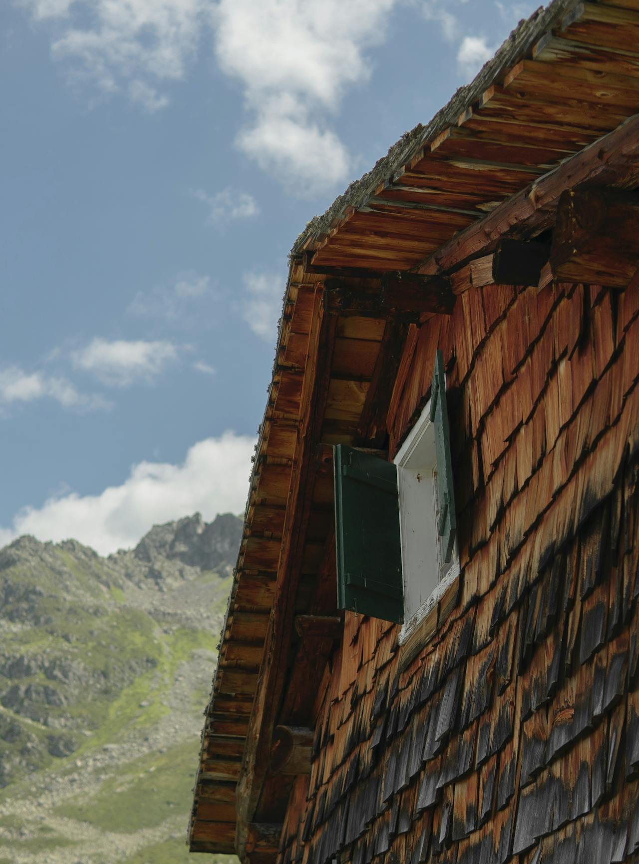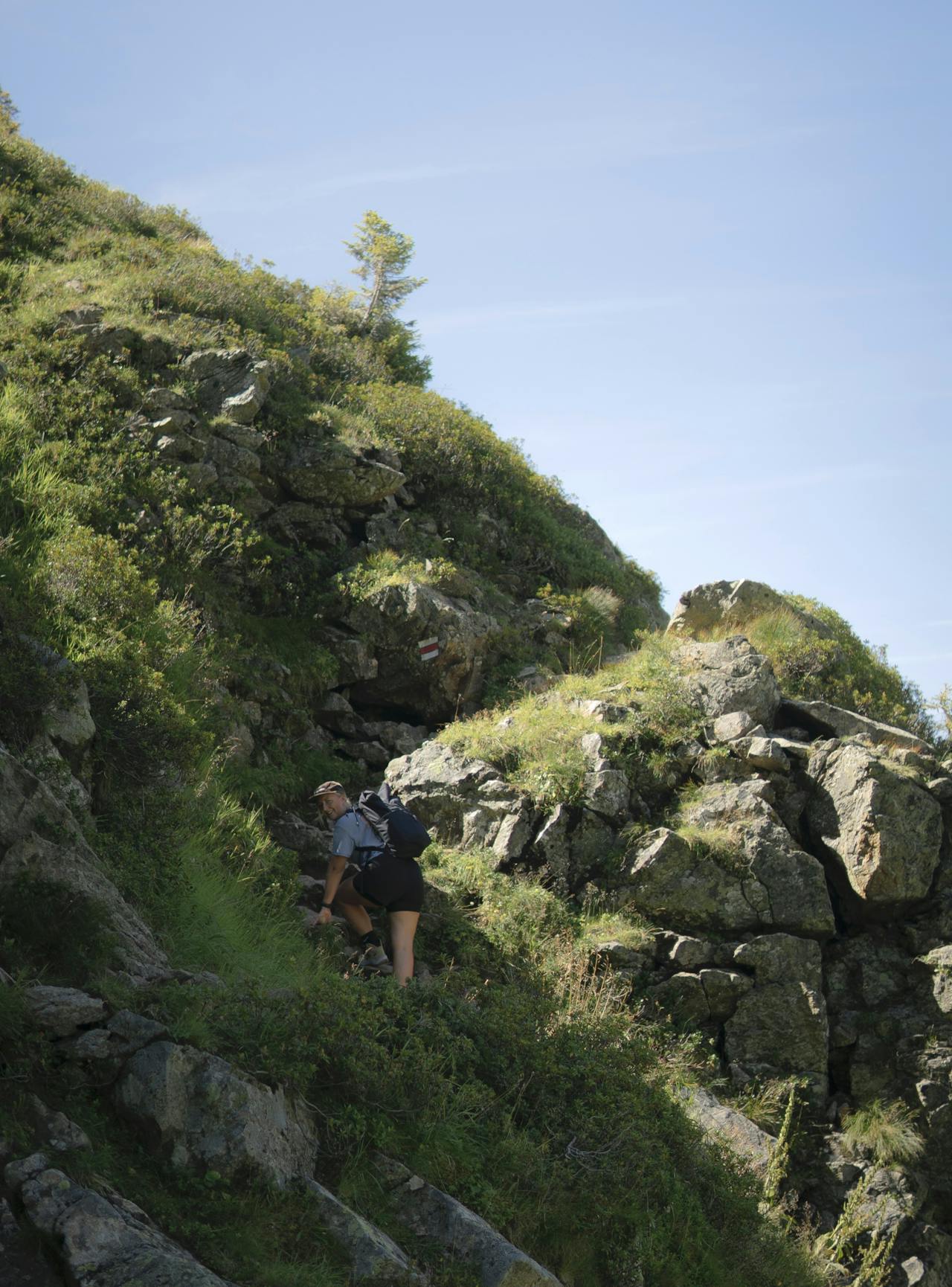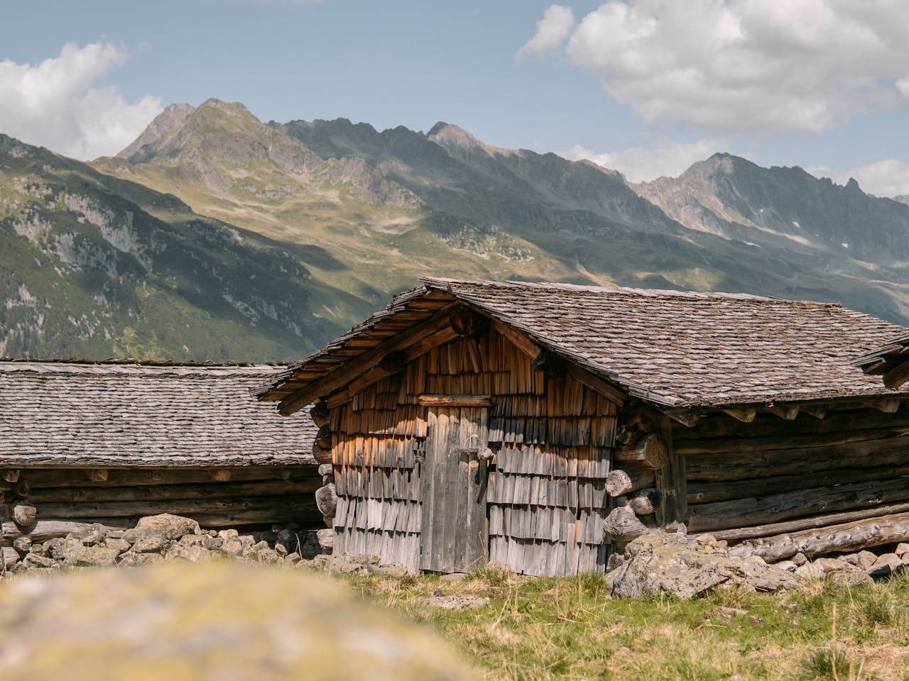 Erfrischt, super motiviert und mit neuer Energie begann für uns der zweite große Teil der Wanderung: Der Abstieg zum eigentlichen Ziel - der Alguesalpe. Bevor der Wanderweg felsiger und steil hinab geht, empfehlen wir: haltet noch kurz auf einen Felsen und genießt einfach ganz bewusst den Ausblick! Die Kulisse hat uns kurz die Sprache verschlagen! Ein richtiger Wow-Moment. Nehmt euch die Zeit, denn wer denkt: „Die Wanderung war bis hierhin doch easy peasy!“, den:die müssen wir jetzt vorwarnen, ab jetzt beginnt der schwierige Teil der Wanderung. Ab dem Ausblicksfelsen gibt es 30% steile Gefälle, die uns einige Kletterkünste abverlangten. Die Wanderwege waren teilweise nicht gut ersichtlich, weswegen wir ab und an dezent vom Weg abkamen. Dabei immer wieder in unserem Blickfeld: die Alpguesalpe. Die Alpguesalpe ist ein kleines Ensemble aus traditionell gebauten Holzhütten, die vor allem für Tiere genutzt werden - das „bauliche“ Highlight der Strecke und Namensgeber der Wanderung. Eine Einkehr ist hier leider nicht möglich.